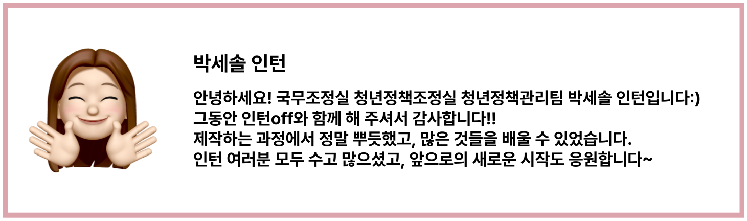 국무조정실 김영민 인턴 🙋♂️: 저 스스로 인턴 생활하면서 느꼈던 부분이에요. 일을 할 때는 힘들고 어렵지만 마무리했을 때 그 기분이 너무 좋았어요. ✨ 게다가 부여받은 일을 주무관님께 마무리해서 드렸는데 칭찬해주셨을 때 그 순간만큼은 내가 조금이라도 도움이 된 것 같아 일하는 것이 보람찼어요. 일을 마무리했을 때 쾌감과 부여받은 일을 정확히 해냄으로써 받은 칭찬 덕분에 일 하는 것이 정말 좋았고 즐거웠던 것 같습니다. 😄 |